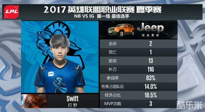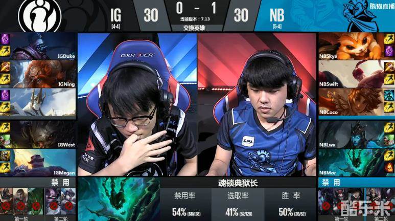 IG使用的是一套以中路卡牌为核心的节奏阵容,在比赛前期,NB中野很好的针对了卡牌,NB很快便将IG的三路外塔拿下,虽然人头有着劣势,但经济上有着不错的领先。比赛进入中期,IG利用两路的分推拖住了节奏,NB迟迟的打不开局面,IG很好的拖住了节奏。但是连续的几波交战后,NB凭借着阵容强大的团战能力,成功拿下大龙。拿下大龙后NB快速的推塔,滚起雪球。最终,NB在先阵亡大嘴的情况下与IG接团,成功4V5将IG团灭,顺势一波结束了比赛拿下首局。