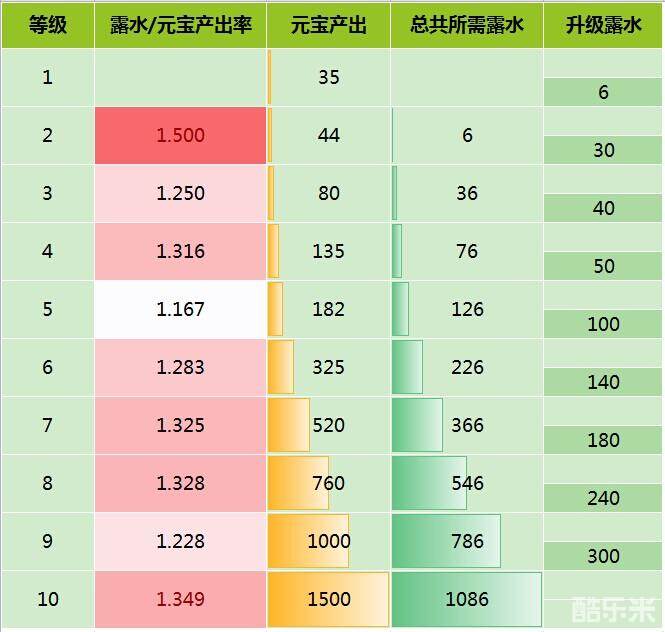 一般平民玩家每天种种2级的,偶尔来个10级的就差不多了元宝产出和露水投入的增加量以柱状图显示,能更直观的看出增加量的多少了。