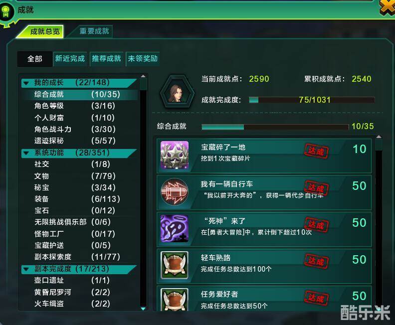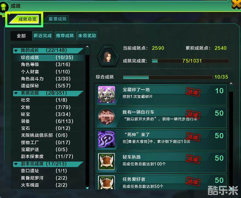 成就总览可以查看在游戏中可以完成的所有成就。其他页签包括最近完成的成就,推荐成就(目前最为接近的成就)以及未领奖励(已经完成成就目标但是没有领取相应的成就奖励)。