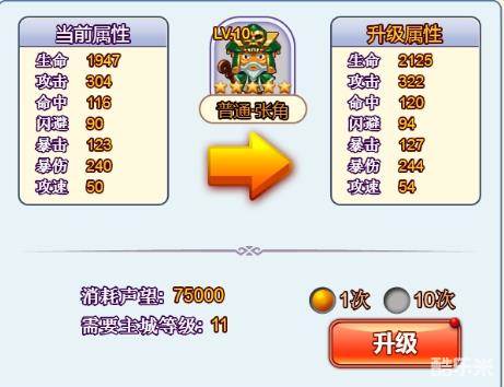 武将升级能够提升整体的属性,特别是攻速这个属性,可以让你更快出手,不过武将等级受限于主城等级,需要先提升主城等级才能够提升武将等级!