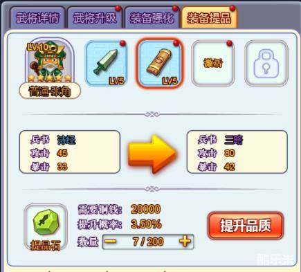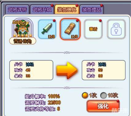 装备强化不及武将升级属性全面,但是可以更加集中的去提升武将某一方面的属性,比如说攻击、暴击这些的属性自然是越高越好了。另外还可以通过提晶石提品装备,但是要注意哦,装备提品是有成功率的,有时候消耗了铜钱不一定能提品成功,现在并没有物品保证百分之百成功!这就要看大家的RP啦~