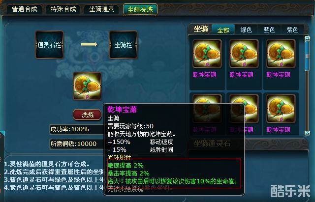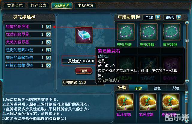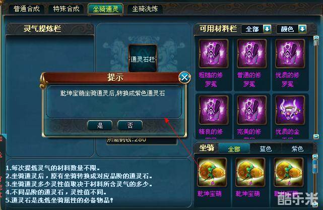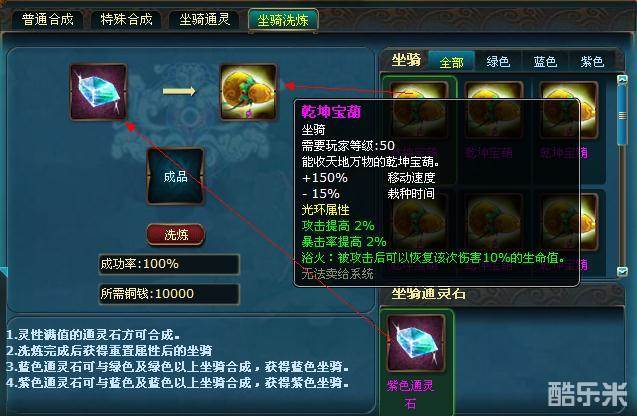 只有灵性满值的通灵石才可进行坐骑洗炼,蓝色通灵石可参与绿色及绿色以上坐骑洗炼,获得蓝色坐骑;紫色通灵石可参与蓝色及蓝色以上坐骑洗炼,获得紫色坐骑。