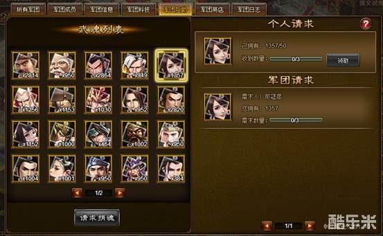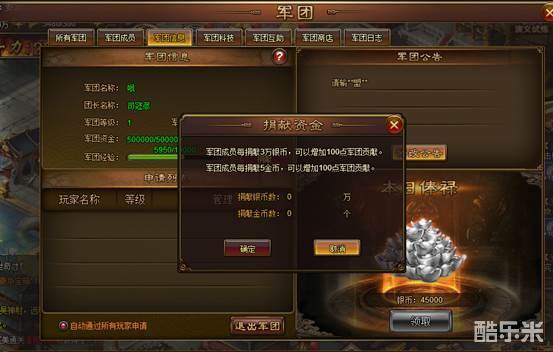 ③在军团信息中点击“捐献”,可为军团捐献资金和增加军团经验,资金用于给军团成员发放每日俸禄;捐献资金分为银币和金币,每捐献3W银币或5金币可增加100点军团贡献。