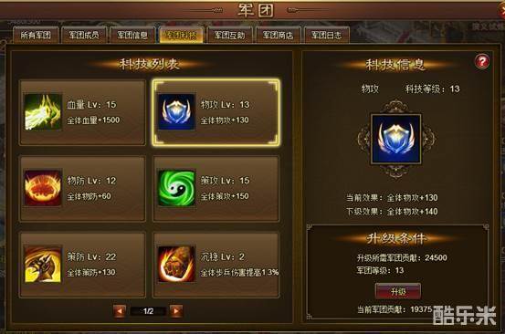 ④军团科技界面可以提升科技等级,科技等级需要消耗一定的军团贡献,且需要军团达到一定等级,科技等级越高属性加成越高,科技等级只给己方武将加成。