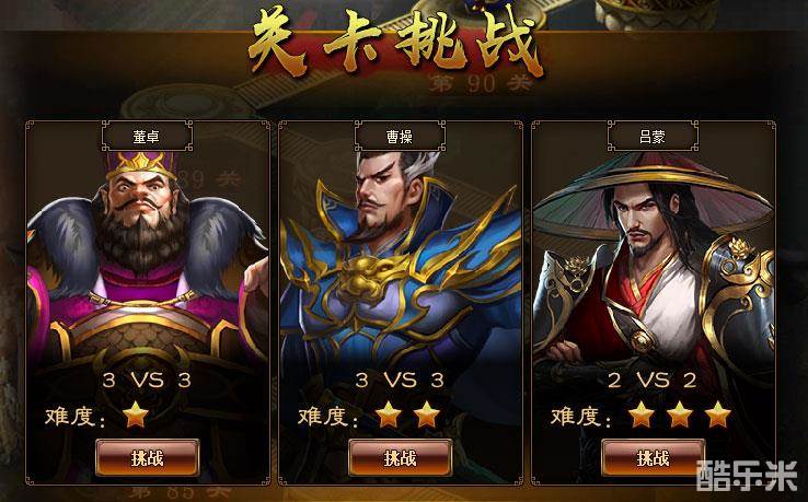 当然这里布阵也是十分有讲究的,每一关的挑战对象都不一样,分成一星到三星,而且这里的挑战模式也分成1V1、2V2、3V3这样,如果是1V1的时候,大家可以直接选择你武将阵容里单挑最强的,最好技能是单体攻击的,杀伤更大!如果是2V2,就将他们放前后,前面来个肉盾,后面依然是放输出;3V3可以选择2输出+1肉盾,也可以1输出1辅助1肉盾。