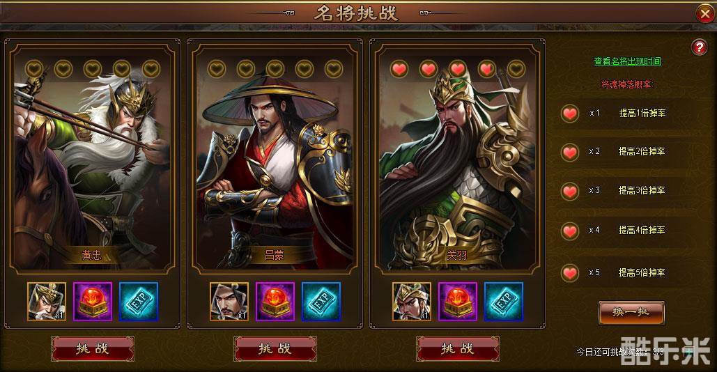 每天可挑战的武将都不一样,在0点就会刷新,从礼拜一到礼拜日,每天可供我们挑战的武将都是不同的,虽然显示出来就三个可挑战的,如果不是你想要的,就直接换,只要有当天有你想要的武将,随便刷新都可以刷出来。