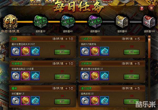 再继续跟着主线任务升到20级以后,就有军团和国战功能了,而且极品三国志游戏里国战并没有什么时间限制,全天候开放,你想什么时候打都可以,参加国战就可以得到大量的经验和功勋奖励,武将可以一边参加国战,一边去做主线和支线,不会冲突,顺着主线可以升到38和39级,一般人第一天都是练到这里的,因为从这里就开始卡级了,我们就可以再去做国战里的任务,然后跑商活动开了也去做,这些都是有经验的,之后的经验升级可以从刷关卡和完成每日任务以及继续攻城来获取!