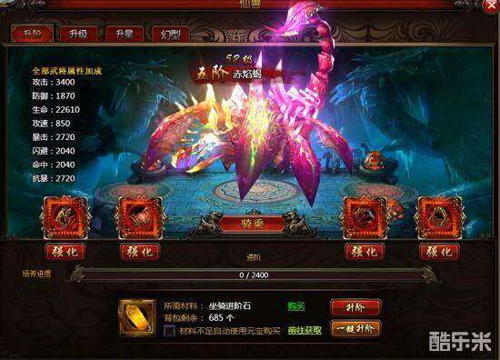 提升坐骑的等阶,不仅可改变坐骑的形象,让坐骑变得更加炫酷,同时,还可以获得大量的属性加成。