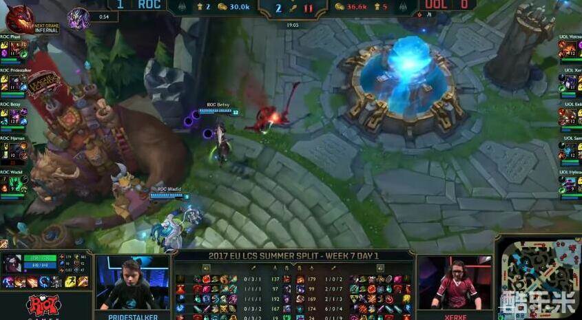 ROC战队对阵的是欧洲小组赛排名第二的UOL战队,第一局比赛Pridestalker的卡兹克7/3/6数据,76%的数据顺利帮助队伍carry比赛,毕竟卡兹克在7.14版本中暮刃加强后受益良多,也是一个非常强势的打野英雄。因此第二局比赛Pridestalker决定玩杂技,选择了凯隐打野。凯隐的清野能力确实是比对手的瑟庄妮更快,但这个英雄缺乏稳定控制,加上视野一直处于劣势,ROC战队也未能利用凯隐打出什么gank配合。直到12分钟己方锤石勾中了敌方的库奇后,凯隐才收获第一个人头。
