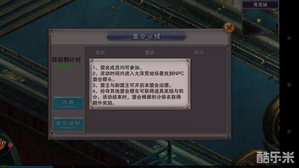 4.抢夺其他盟会镖车可获得道具奖励与积分,活动结束积分最高的盟会根据排名获得额外奖励。