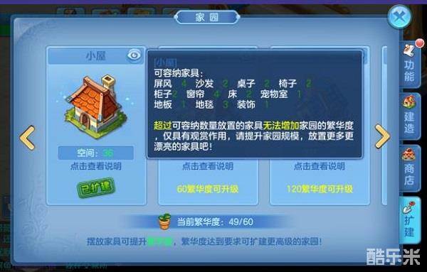 刚建好的房子只有一张床和一间宠物室,玩家需要到家园商店购买喜欢的家具装饰,提升繁华度,当繁华度达到要求时才可以扩建更高级更大空间的家园!