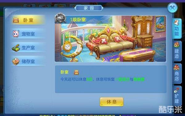 买了一座房子,当然不是只用来看的了,最重要的是用来作为休息的嘛。使用卧室休息可恢复一定活力与饱食度;宠物屋是宠物训练、喂养、休息的地方;生产室是果实栽培和魔药研制,还有储存室的使用。总之,合理使用家园也是有大大的好处的。但也别忘了家园繁华度和清洁的提升喔。