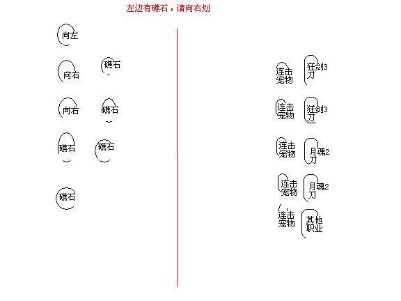 滑雪活动,玩家3-5人组队参加(若是少于3人,守护会出战),报名后依次去各个裁判点签到,哪个划到终点用的时间最少,就上排行榜。签到途中会遇到怪。遇怪时,如上图所示,小编简单画了个滑雪遇怪后的草图。上方会有提示向左还是向右划,提示哪个就集火打哪个,人物和怪的伤害是很低固定的,一个怪打8下就会死。所以这个活动要想速度快,就要多组点可以3刀的狂剑和可以2刀的月魂,宠物也尽量用连击宠物。剩下的就是配合了。