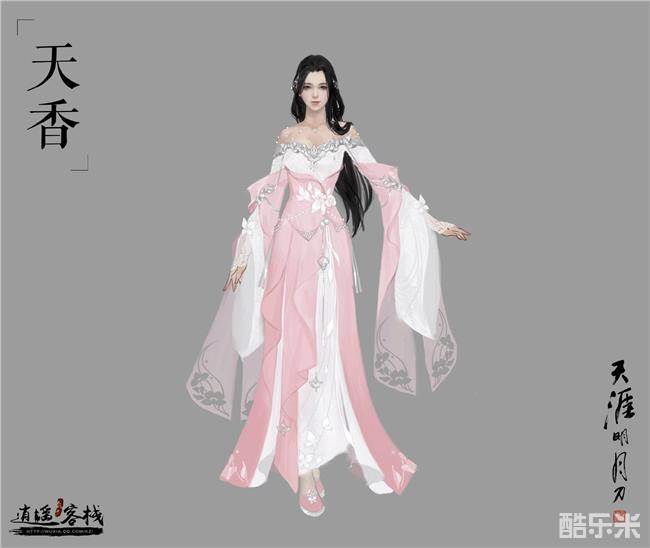 竞夸天下双无绝,独立人间第一香。此次T7的天香时装颜色以粉白色为主,和以往的校服不同,丰富了天香弟子的柔美感,发型方面,也选用了中分的长发,起到了修饰脸型的作用。配饰方面,项链部分和T5的设计一样采取了珍珠为装饰,胸前的配饰以银色的金属为主,腰部的花朵则是桃花和莲花的花瓣,彰显天香弟子的优雅,鞋子上用了银色的蝴蝶配饰,可以看到,裙摆下方的暗纹是采用了高雅纯洁的莲花。那么总的来看,天香的这套校服设计是非常典雅美观的。