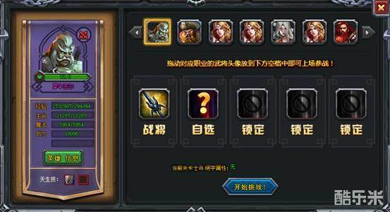 3、点击挑战关卡,进入阵型设置,拖动武将头像拉到对应的空格,部分关卡会有武将职业要求,设置完毕后就点击开始挑战。