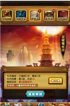 勇闯锁妖塔,小皮手游网小编觉得像是探险寻宝的玩法,玩家们通过击杀每一层的boss才能爬更高的楼层,在锁妖塔中玩家们可以获得大量的银两和西游道具,不过每一层都会比前一层更加厉害哦。