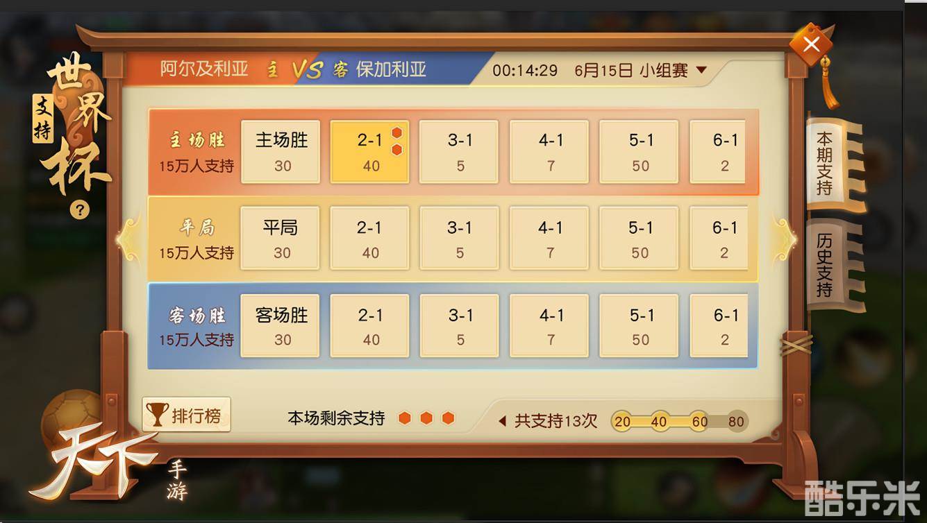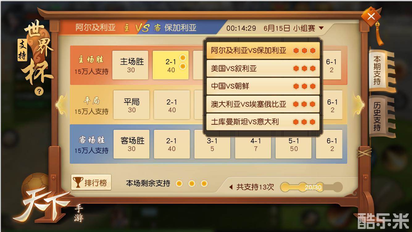 世界杯足球饕餮盛宴即将来临,《天下》手游世界杯竞赛玩法火爆开启。提交相关道具即可对未来一周世界杯精彩赛事开启竞猜活动,选择你预测的胜负平及比分,还可对你支持的球队给予不同热度的支持。如能成功预测,则有丰厚大礼让你满载而归。后续丰富玩法持续解锁中,决赛还有更多惊喜。快来《天下》手游做出你的选择,为你支持的球队呐喊助威。参与预测发家致富,来纵享世界杯狂欢盛宴!