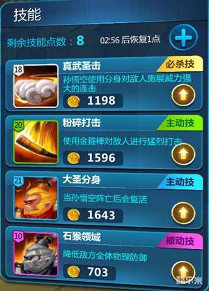 神灵共有两个主动技能,一个必杀技和一个被动技,必杀技是需要积蓄能量才能发动.花费技能点数和少量金币便能提升每个技能的攻击力或者属性,从而增加战力.