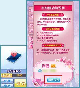 如果伴侣之间的感情没有破裂,也可解除伴侣关系。主动要求解除伴侣关系的一方需要购买道具“伴侣解除卡”。 之后,从大地图进入“姻缘树”,在左边界面选择“解除关系”(注意:解除伴侣关系会消耗一个伴侣解除卡。结婚后4天之内为蜜月期,蜜月期内无法解除伴侣关系):