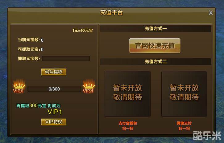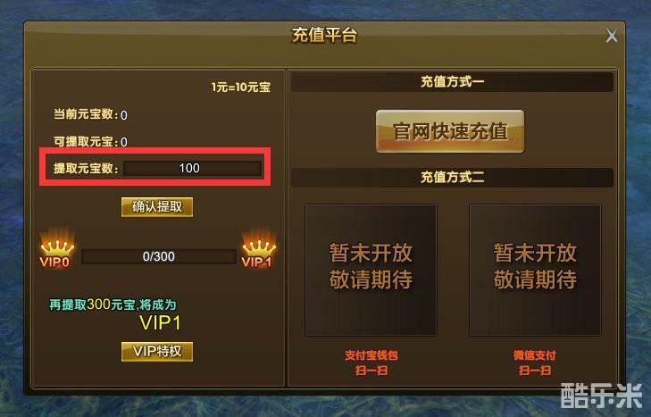 1、点击游戏界面左上方的“充值”按钮,打开充值平台,可以查看到如下图所示的可提取元宝数。