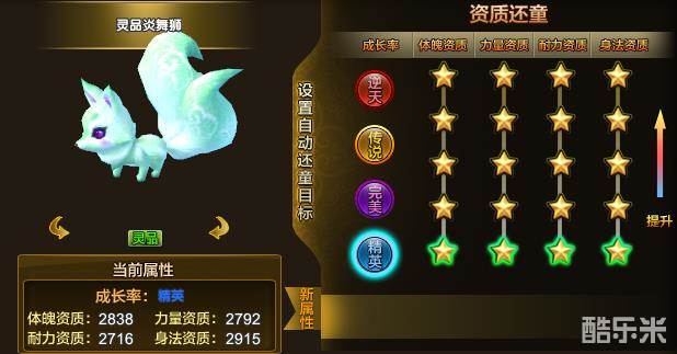 第一步:鉴定成长率,点击右下角工坊,进入仙兽界面的灵宠鉴定,选中自己的灵兽(需要收回状态哦),点击还童,不管出了什么资质都无所谓,如果人品逆天出了传说逆天成长率的当我没说...我可能玩了假玉莲花(偷笑)。