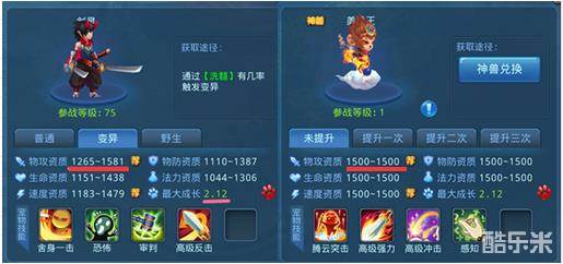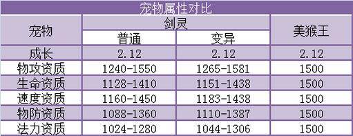 综合分析:攻击资质方面变异剑灵略高于猴子20-30点(满进阶的情况下)。三围属性略逊色于猴子(由于洗宠只能兼顾到主属性成长以及技能,所以其他属性肯定会比猴子的全属性1500低不少)