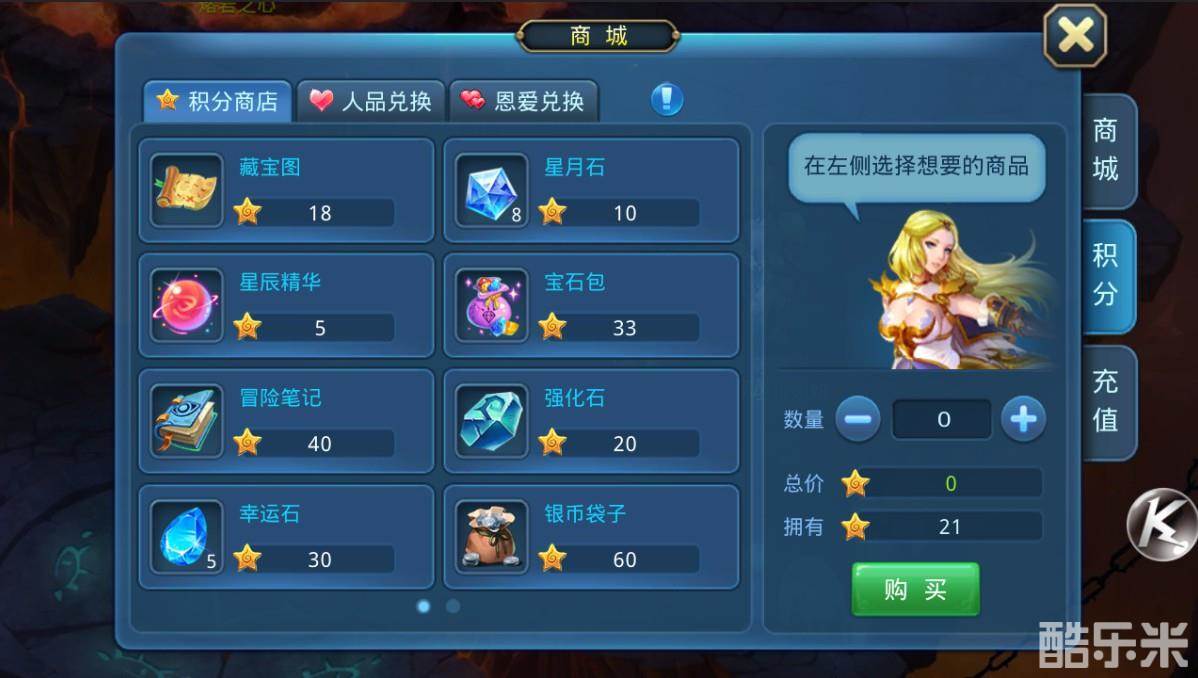 最后我们来说一下积分!在星辰大陆里,除了钻石银币和金币可以兑换到道具,用积分、人品、恩爱和帮贡也是可以换到很多很好的道具的。如果充分利用积分,可以省下很多买道具的钱之余,还可以赚一笔!例如兑换藏宝图和宝石袋,挖到道具和开出宝石后,如果不需要,就可以卖了换金币!