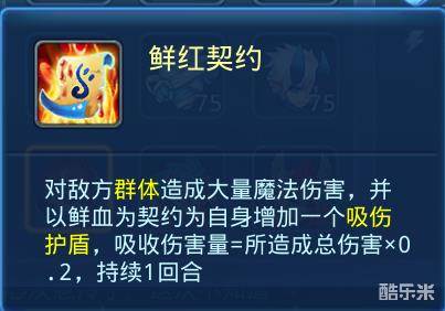 鲜红契约的技能描述是:对敌方群体造成大量魔法伤害,并以鲜血为契约为自身增加一个吸伤护盾,吸收伤害量=所造成总伤害*0.2,持续一个回合。喵子来为大家分析一下,这个技能分为两个部分,一个是打人,一个是防御。法术群攻就不用细说了,那么吸伤护盾有什么用呢?