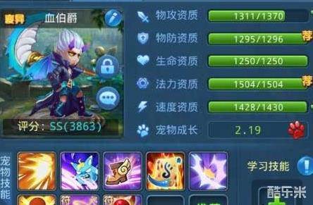 资质方面:推荐橙色或者红色成长,速度资质接近1500,法资1500以上,生命资质1100以上,防御资质1300左右。这里必须重点说一下速度和法术资质,这两个不能将就,必须接近1500,速度资质影响特别大。
