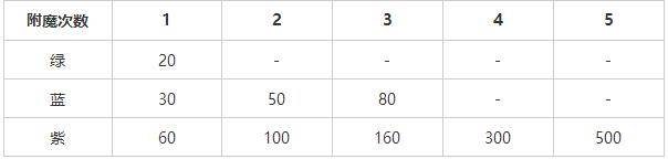 下表就是不同品质装备附魔所需的点数,要提及的是,白色的装备是无法附魔的。