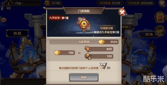 如果刷新法宝贡献不够,门派右上角有个捐献,也可以兑换贡献。这个其实算起来要比在法宝商店买的便宜。
