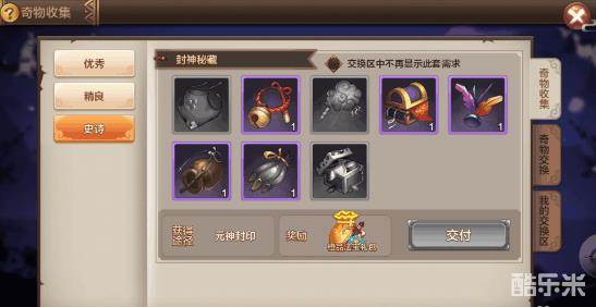 在奇物兑换中史诗级的奖励就是橙色法宝的袋子。