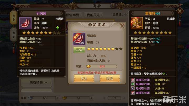 当少侠通关英雄试炼并开启关卡宝箱凑够5个重楼肩碎片之后,可以合成重楼肩。重楼肩的装备条件是等级56级,但是看其属性就知道重楼肩的属性远超50级装备。