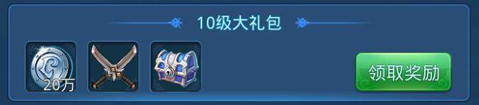 十级礼包:20万银币、10级对应职业武器、10级全套装备