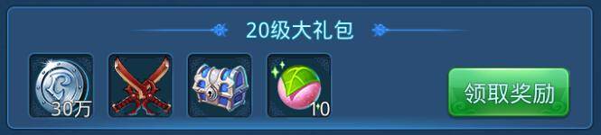 二十级礼包:30万银币、20级对应职业武器、20级全套装备、10个星辰精华
