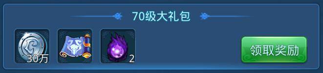七十级礼包:30万银币、高级魔兽要诀1本、月亮之魂2个