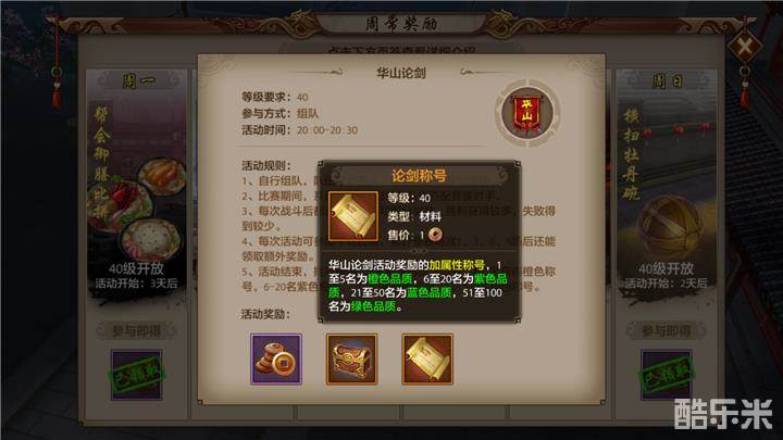 比赛一共分为10场,在少侠分别打完1、3、6、9场之后,都可以获得华山宝箱,开启宝箱可以获得大量奖励。所以建议少侠们不管输赢也要打满9场,无论比赛失意还是得意,奖励总是要拿走的。而且打比赛还可以获得不少的铜币和经验,同样无论胜负都能够得到,当然,输了得到的经验和铜币要比赢了得到的少一些。