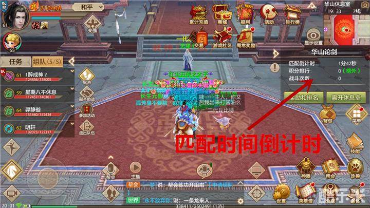 组成队伍来到无崖子处后由队长点击进入华山休息室,来到华山休息室之后,比赛并不会马上开始,而是有一个队伍匹配的时间。在这段时间之内,队伍里的少侠可以互相商量战术配合。每一场比赛结束都会有一段队伍匹配时间,少侠们可以在激烈的战斗之后,平复一下心情,总结一下上一场比赛的得失。