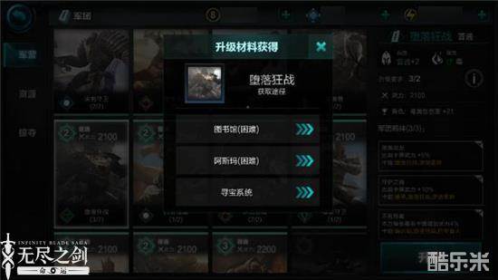 堕落狂战普通军团卡牌,可以通过金币寻宝系统概率获得,同时在《无尽之剑:命运》剧情模式中的困难难度指定副本中,通关相关副本就有机会概率获得。困难副本中的“图书馆”和“阿斯玛”都可以获取,但最低的“图书馆”副本推荐等级也需要达到43级。