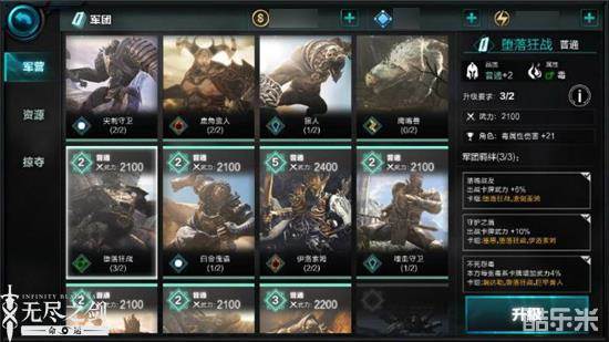 《无尽之剑:命运》中的堕落狂战军团卡牌,属于获取难度相对高的初始品质普通的军团卡牌。堕落狂战能为角色提升毒属性伤害效果,拥有三种军团羁绊能力。堕落狂战虽然是普通军团卡牌,但获取难度相对较高。