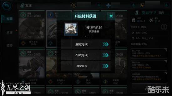 变异守卫军团卡牌在《无尽之剑:命运》中获取难度较低,只需要通关地狱难度关卡第一章后,就可以通过不断扫荡地狱1.5副本“庭院”获得。还可以在地狱难度关卡第十二章BOSS本的12.5副本“石碑”内获取,此副本推荐等级为58级。另外,通用渠道寻宝系统,也会概率产出变异守卫军团卡牌。