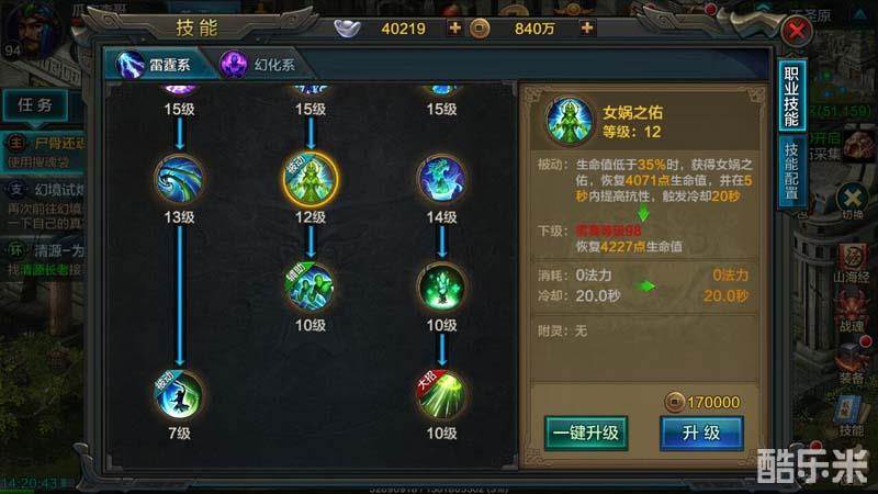 女娲血脉增加的法术攻击力不仅能提升雷霆系法术攻击技能的伤害,而且还可以提升治疗技能的治疗效果,增加的法术防御力和最大生命值能够提升神医的生存能力。神医的法术防御力较高,在面对法术攻击职业时则多了一份胜算,神医也可以在装备和宝石中选择增加物理防御力的,来平衡一下物防和法防。由于法术攻击力、法术防御力和最大生命值是按百分比提升的,基础属性越高增加的也越多,选择这三种属性的装备能获得更高的收益。