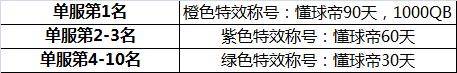 同时,官方统计每个服兑换“世界杯冠军”的国家队卡数量排名,每个服第一名(即兑换冠军队卡最多的玩家)将获得1000QB、橙色特效称号懂球帝90天的奖励;假如球队卡数量相同,按照兑换最后一张冠军卡片时间,兑换时间早的排名靠前。