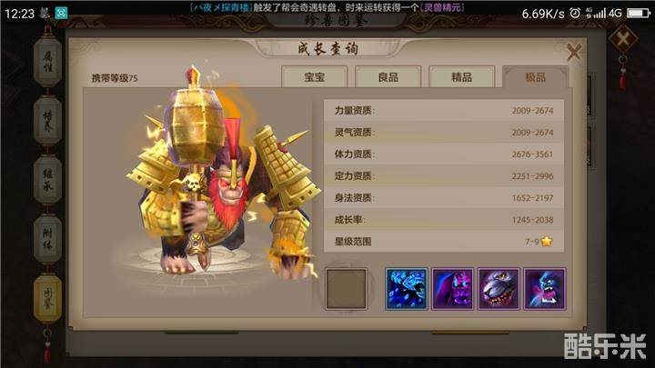 体力和定力资质成长最高,血量和防御非常高,生存力强,可以搭配为主人加血和加蓝的技能,比如共生和血祭。还可以搭配一些辅助主人的技能,比如破绽,虚弱等等,为主人增加属性的借力,强身等等也可以自己搭配。推荐珍兽皮皮虾、龙龟、神猿。