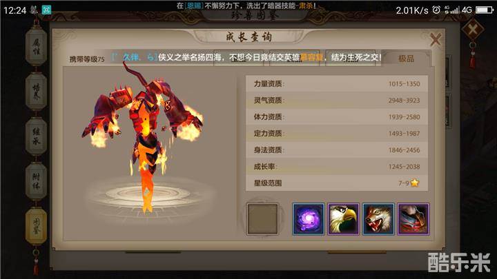 灵气资质成长最高,内功攻击型,攻击力非常的高,可以帮助主人一起战斗输出。这类珍兽技能的选择还是很多的,可以选择群攻的技能,然后配上法魂,痛击,连击这些输出型的技能,也可以搭配为主人增加属性的技能。推荐珍兽丘比特、鸳鸯、岩魂。