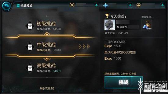 《无尽之剑:命运》挑战模式中,所有难度的挑战获得的奖励都是经验值,区别只是多与少。中级挑战中,击杀BOSS可得1500经验值,完成指定条件可获得1000经验值。指定条件这一项内容,每日随机刷出,但在当日内挑战1次与挑战2次都是一致的。