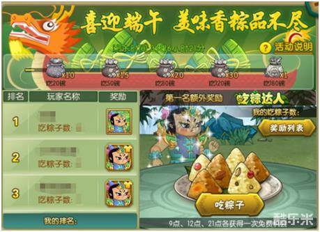 端午活动期间每天可以免费吃粽子3次,每次最多可以吃8个粽子!之后需要花费100元宝(每次50元宝递增,500元宝封顶)才能继续吃粽子。活动期间吃粽子20个可以获赠潜能种子福袋10个;吃粽子50个可以获赠潜能宝石福袋15个;吃粽子80个可以获赠潜能宝石福袋20个;吃粽子120个可以获赠潜能宝石福袋30个;吃粽子180个可以获赠战斗法宝福袋1个。活动期间吃粽子最多的玩家,将会获得“吃粽达人”称号,活动期间吃粽子前三的玩家,获得六娃“端午盛装”皮肤与大量银币。