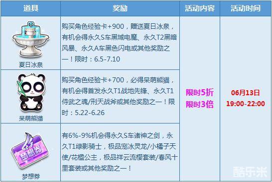 每周三惊喜夜,飞车福利接连送!6月13日19:00-22:00期间,【夏日冰泉】、【呆萌熊猫】、【梦想券】三款宝箱限时5折出售,更有限时3倍极品爆率,有机会赢永久S车【黑域电魔】、永久T2【黑暗风暴】、永久S车【诸神之剑】以及其他各式好礼,赶紧来参与。