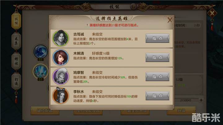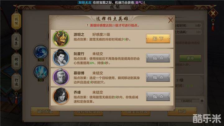 关于这个技能,风波恶(伤害增加10%)、苏星河(冷却时间减少2秒),这两个指点英雄的效果前者可以提升伤害,后者可以增加技能使用频率,都可以较好得增加输出量,而阿紫和慕容复的效果触发功能性比较强,也需要一定的条件,所以不适合刷副本和江湖历练。