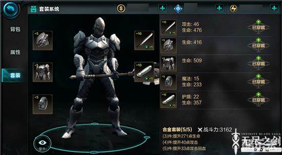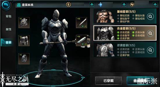 《无尽之剑:命运》在战力的提升方面可谓是五花八门各有千秋,套装,则是一个非常有趣的设点,类似于时装,又类似于养成宠物。在玩家开启套装系统后,这里将面临一个抉择,合金套装与逆袭套装。